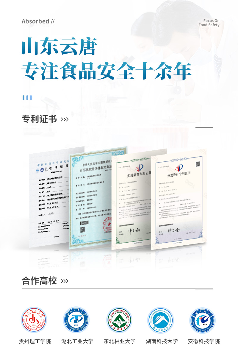 山東云唐智能科技有限公司生產(chǎn)的果蔬肉類檢測儀,采用手提箱式一體化設計,可快速檢測幾十種項目,包含各種蔬菜水果中有機磷和氨基甲酸酯類農(nóng)藥殘留,病害肉診斷:肉中組胺、揮發(fā)性鹽基氮;各種肉食品中瘦肉精激素類殘留、抗生素、獸藥殘留等現(xiàn)場的定性定量檢測。